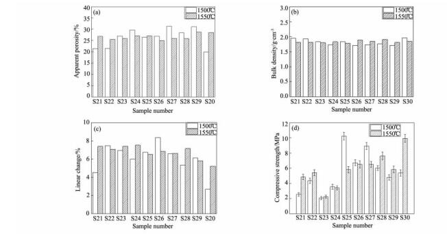 2 不同結合(he)劑(ji)試樣在 1500 ℃和(he) 1550 ℃燒后(hou)性能( a) 顯氣孔率; ( b) 體(ti)積密度; ( c) 線(xian)變(bian)化率和(he)( d) 耐壓強度