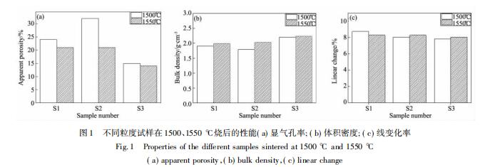 圖 1 是試(shi)(shi)樣(yang)(yang)經過不(bu)同(tong)溫(wen)度(du)(du)(du)燒(shao)(shao)(shao)(shao)后的(de)性能圖。從(cong)圖 1a 和 b 可以看(kan)出,不(bu)同(tong)粒(li)度(du)(du)(du)組成試(shi)(shi)樣(yang)(yang)在 1500 ℃ 燒(shao)(shao)(shao)(shao)后的(de) 氣(qi)(qi)孔率明顯(xian)高于在 1550 ℃燒(shao)(shao)(shao)(shao)后試(shi)(shi)樣(yang)(yang)的(de)氣(qi)(qi)孔率,S2 試(shi)(shi)樣(yang)(yang)在不(bu)同(tong)溫(wen)度(du)(du)(du)燒(shao)(shao)(shao)(shao)后氣(qi)(qi)孔率和體積(ji)(ji)密(mi)度(du)(du)(du)的(de)變化較大; S3 試(shi)(shi) 樣(yang)(yang)的(de)氣(qi)(qi)孔率在不(bu)同(tong)的(de)溫(wen)度(du)(du)(du)時與 S1、S2 相比有.小的(de)顯(xian)氣(qi)(qi)孔率,有.大的(de)體積(ji)(ji)密(mi)度(du)(du)(du)。原因是: 隨(sui)著燒(shao)(shao)(shao)(shao)結溫(wen)度(du)(du)(du)的(de)高,顆粒(li)燒(shao)(shao)(shao)(shao)結程度(du)(du)(du)增加(jia),顆粒(li)與顆粒(li)之間結合緊密(mi)。在相同(tong)燒(shao)(shao)(shao)(shao)結溫(wen)度(du)(du)(du)時,S3 試(shi)(shi)樣(yang)(yang)的(de)堆積(ji)(ji)更緊密(mi),氣(qi)(qi)孔得到 更充分(fen)地(di)填充。