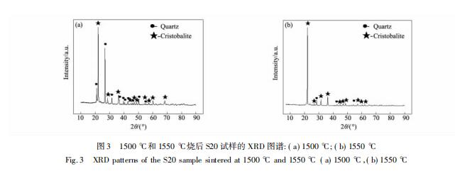 圖(tu) 2a 和(he) b 分別是不(bu)同(tong)(tong)(tong)結(jie)(jie)(jie)(jie)合劑(ji)試(shi)(shi)(shi)樣(yang)(yang)(yang)(yang)(yang)在(zai)(zai) 1500 ℃和(he) 1550 ℃燒后(hou)的(de)(de)(de)(de)(de)(de)(de)顯(xian)氣(qi)(qi)(qi)孔(kong)(kong)率(lv)(lv)(lv)(lv)(lv)(lv)和(he)體(ti)積密度(du)(du)(du)。從圖(tu)中知(zhi)道,1500 ℃時 S20 試(shi)(shi)(shi)樣(yang)(yang)(yang)(yang)(yang)的(de)(de)(de)(de)(de)(de)(de)顯(xian)氣(qi)(qi)(qi)孔(kong)(kong)率(lv)(lv)(lv)(lv)(lv)(lv).低,體(ti)積密度(du)(du)(du).高(gao)(gao)。1550 ℃ 時 S26 試(shi)(shi)(shi)樣(yang)(yang)(yang)(yang)(yang)的(de)(de)(de)(de)(de)(de)(de)顯(xian)氣(qi)(qi)(qi)孔(kong)(kong)率(lv)(lv)(lv)(lv)(lv)(lv).低,S29 的(de)(de)(de)(de)(de)(de)(de)顯(xian)氣(qi)(qi)(qi)孔(kong)(kong)率(lv)(lv)(lv)(lv)(lv)(lv).高(gao)(gao)。 S20 試(shi)(shi)(shi)樣(yang)(yang)(yang)(yang)(yang)在(zai)(zai)1500 ℃和(he)1550 ℃的(de)(de)(de)(de)(de)(de)(de)顯(xian)氣(qi)(qi)(qi)孔(kong)(kong)率(lv)(lv)(lv)(lv)(lv)(lv)相差較大(da)(da)。原因是在(zai)(zai)1500 ℃時 S20 試(shi)(shi)(shi)樣(yang)(yang)(yang)(yang)(yang)中加(jia)(jia)(jia)(jia)的(de)(de)(de)(de)(de)(de)(de)結(jie)(jie)(jie)(jie)合劑(ji)很(hen)好(hao)地(di)促進燒結(jie)(jie)(jie)(jie),有(you)(you)(you)利(li)于(yu)試(shi)(shi)(shi)樣(yang)(yang)(yang)(yang)(yang)中氣(qi)(qi)(qi)孔(kong)(kong)的(de)(de)(de)(de)(de)(de)(de)排出,提(ti)高(gao)(gao)材料的(de)(de)(de)(de)(de)(de)(de)致密性(xing)。 圖(tu) 2c 是不(bu)同(tong)(tong)(tong)結(jie)(jie)(jie)(jie)合劑(ji)試(shi)(shi)(shi)樣(yang)(yang)(yang)(yang)(yang)在(zai)(zai) 1500 ℃和(he) 1550 ℃燒后(hou)的(de)(de)(de)(de)(de)(de)(de)線變(bian)(bian)化(hua)(hua)(hua)率(lv)(lv)(lv)(lv)(lv)(lv)。不(bu)同(tong)(tong)(tong)試(shi)(shi)(shi)樣(yang)(yang)(yang)(yang)(yang)燒成(cheng)后(hou),試(shi)(shi)(shi)樣(yang)(yang)(yang)(yang)(yang)的(de)(de)(de)(de)(de)(de)(de)線變(bian)(bian)化(hua)(hua)(hua)率(lv)(lv)(lv)(lv)(lv)(lv)都(dou)為(wei)(wei)(wei)(wei) 正值,表現為(wei)(wei)(wei)(wei)體(ti)積膨(peng)脹。1500 ℃ 時 S26 試(shi)(shi)(shi)樣(yang)(yang)(yang)(yang)(yang)的(de)(de)(de)(de)(de)(de)(de)線膨(peng)脹率(lv)(lv)(lv)(lv)(lv)(lv).高(gao)(gao),為(wei)(wei)(wei)(wei) 8. 37% ,S20 的(de)(de)(de)(de)(de)(de)(de)膨(peng)脹率(lv)(lv)(lv)(lv)(lv)(lv).低,為(wei)(wei)(wei)(wei) 2. 69% 。 1550 ℃時線膨(peng)脹率(lv)(lv)(lv)(lv)(lv)(lv).高(gao)(gao)為(wei)(wei)(wei)(wei) S24,為(wei)(wei)(wei)(wei) 7. 5% ,S20 的(de)(de)(de)(de)(de)(de)(de)膨(peng)脹率(lv)(lv)(lv)(lv)(lv)(lv).低,為(wei)(wei)(wei)(wei) 5. 23% 。因此可以判斷出在(zai)(zai)粒度(du)(du)(du)相同(tong)(tong)(tong)的(de)(de)(de)(de)(de)(de)(de)情 況下 S20 試(shi)(shi)(shi)樣(yang)(yang)(yang)(yang)(yang)的(de)(de)(de)(de)(de)(de)(de)結(jie)(jie)(jie)(jie)合劑(ji)在(zai)(zai)高(gao)(gao)溫時熔融形(xing)成(cheng)的(de)(de)(de)(de)(de)(de)(de)液相可以更好(hao)的(de)(de)(de)(de)(de)(de)(de)降低顆粒晶型轉變(bian)(bian)帶來的(de)(de)(de)(de)(de)(de)(de)膨(peng)脹。 圖(tu) 2d 是不(bu)同(tong)(tong)(tong)結(jie)(jie)(jie)(jie)合劑(ji)試(shi)(shi)(shi)樣(yang)(yang)(yang)(yang)(yang)在(zai)(zai) 1500 ℃和(he) 1550 ℃燒后(hou)的(de)(de)(de)(de)(de)(de)(de)耐(nai)壓強(qiang)度(du)(du)(du)。1500 ℃時耐(nai)壓強(qiang)度(du)(du)(du).高(gao)(gao)的(de)(de)(de)(de)(de)(de)(de)試(shi)(shi)(shi)樣(yang)(yang)(yang)(yang)(yang)是 S25, 為(wei)(wei)(wei)(wei) 10. 22 MPa,.小的(de)(de)(de)(de)(de)(de)(de)的(de)(de)(de)(de)(de)(de)(de)試(shi)(shi)(shi)樣(yang)(yang)(yang)(yang)(yang)為(wei)(wei)(wei)(wei) S23,** 2. 07 MPa; 1550 ℃時耐(nai)壓強(qiang)度(du)(du)(du).高(gao)(gao)的(de)(de)(de)(de)(de)(de)(de)是 S20,為(wei)(wei)(wei)(wei) 9. 936 MPa,.小的(de)(de)(de)(de)(de)(de)(de) 仍是試(shi)(shi)(shi)樣(yang)(yang)(yang)(yang)(yang)是 S23,** 2. 27 MPa。 S22 與 S21 相比(bi),兩者(zhe)燒后(hou)顯(xian)氣(qi)(qi)(qi)孔(kong)(kong)率(lv)(lv)(lv)(lv)(lv)(lv)和(he)體(ti)積密度(du)(du)(du)沒有(you)(you)(you)大(da)(da)的(de)(de)(de)(de)(de)(de)(de)變(bian)(bian)化(hua)(hua)(hua),但 S22 的(de)(de)(de)(de)(de)(de)(de)線變(bian)(bian)化(hua)(hua)(hua)率(lv)(lv)(lv)(lv)(lv)(lv)和(he)耐(nai)壓強(qiang)度(du)(du)(du)比(bi) S21 高(gao)(gao) 一些,這(zhe)可能是因為(wei)(wei)(wei)(wei)隨著 B2O3 的(de)(de)(de)(de)(de)(de)(de)加(jia)(jia)(jia)(jia)入(ru)(ru)量(liang)(liang)增(zeng)(zeng)(zeng)加(jia)(jia)(jia)(jia)促進了石(shi)(shi)英(ying)的(de)(de)(de)(de)(de)(de)(de)燒結(jie)(jie)(jie)(jie),而石(shi)(shi)英(ying)燒結(jie)(jie)(jie)(jie)過(guo)程中會(hui)(hui)有(you)(you)(you)較復雜的(de)(de)(de)(de)(de)(de)(de)相變(bian)(bian),伴 隨著一定量(liang)(liang)的(de)(de)(de)(de)(de)(de)(de)體(ti)積膨(peng)脹,表現為(wei)(wei)(wei)(wei)線變(bian)(bian)化(hua)(hua)(hua)率(lv)(lv)(lv)(lv)(lv)(lv)大(da)(da),而促進燒結(jie)(jie)(jie)(jie)會(hui)(hui)使試(shi)(shi)(shi)樣(yang)(yang)(yang)(yang)(yang)的(de)(de)(de)(de)(de)(de)(de)耐(nai)壓強(qiang)度(du)(du)(du)增(zeng)(zeng)(zeng)加(jia)(jia)(jia)(jia)。 通(tong)過(guo) S21、S23、S24、S25 試(shi)(shi)(shi)樣(yang)(yang)(yang)(yang)(yang)的(de)(de)(de)(de)(de)(de)(de)對(dui)比(bi),后(hou)三者(zhe)的(de)(de)(de)(de)(de)(de)(de)體(ti)積密度(du)(du)(du)與前者(zhe)沒有(you)(you)(you)多大(da)(da)差別,顯(xian)氣(qi)(qi)(qi)孔(kong)(kong)率(lv)(lv)(lv)(lv)(lv)(lv)、線變(bian)(bian)化(hua)(hua)(hua)率(lv)(lv)(lv)(lv)(lv)(lv)和(he)耐(nai)壓強(qiang)度(du)(du)(du)較前者(zhe)有(you)(you)(you)所(suo)上(shang)升。偏(pian)硅(gui)酸鈉(na)可以作為(wei)(wei)(wei)(wei)石(shi)(shi)英(ying)燒結(jie)(jie)(jie)(jie)過(guo)程中的(de)(de)(de)(de)(de)(de)(de)粘結(jie)(jie)(jie)(jie)劑(ji),其(qi)加(jia)(jia)(jia)(jia)入(ru)(ru)量(liang)(liang)增(ze