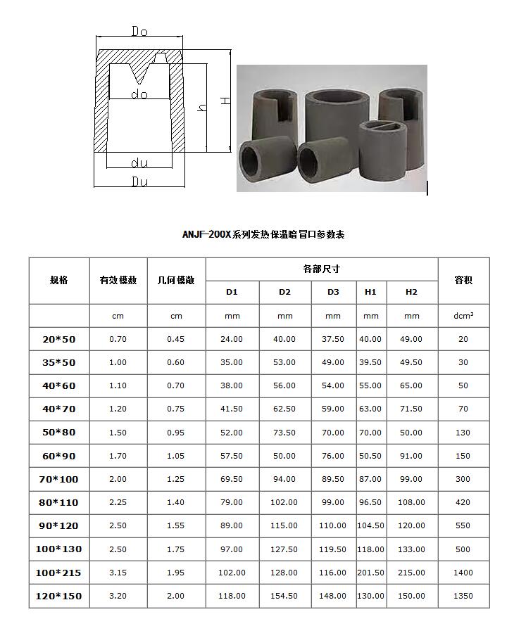 ANJF-200X 發熱保溫(wen)冒口套由多種(zhong)原(yuan)料經(jing)過(guo)特定工藝(yi)制成,具(ju)有高發熱、強保溫(wen)的特點。適(shi)用于各(ge)種(zhong)牌號(hao)的鑄(zhu)鋼、鑄(zhu)鐵件。可(ke)以應用于各(ge)種(zhong)造型(xing)工藝(yi)。該冒口可(ke)配加易割片,澆鑄(zhu)后(hou)的殘(can)骸可(ke)以錘擊敲掉,進一步減(jian)少了切割和打磨(mo)等清(qing)理費用。供貨狀(zhuang)態下(xia)的技(ji)術參(can)數如下(xia):