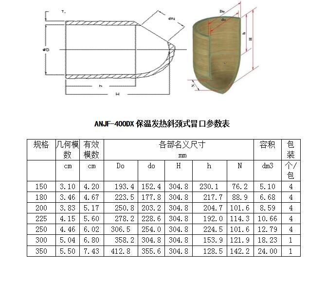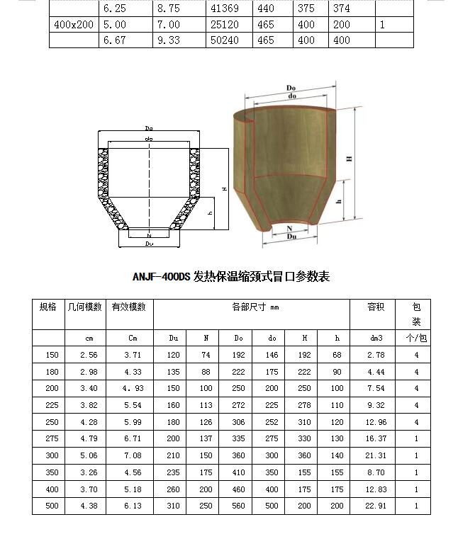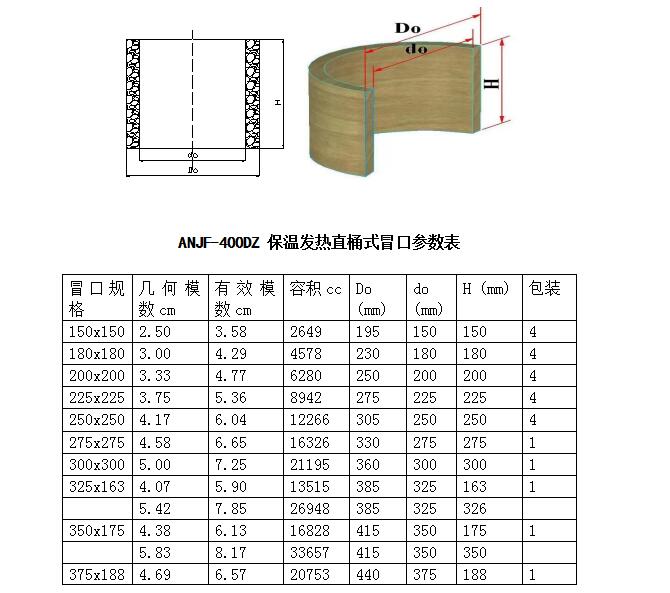 ANJF-400D保溫(wen)發熱冒(mao)(mao)(mao)(mao)口套(tao)由(you)多(duo)種(zhong)原料(liao)經(jing)過特(te)定(ding)工藝制成(cheng),具(ju)(ju)有(you)中(zhong)強發熱、優良(liang)保溫(wen)的(de)特(te)點。冒(mao)(mao)(mao)(mao)口形狀(zhuang)有(you)直桶、縮頸、斜頸等。適用(yong)于大中(zhong)型(xing)黑(hei)色、有(you)色鑄件和(he)各種(zhong)牌號的(de)鑄鋼、鑄鐵件。可以(yi)應用(yong)于各種(zhong)造型(xing)工藝。其中(zhong)縮頸式(shi)冒(mao)(mao)(mao)(mao)口除了(le)有(you)優良(liang)的(de)發熱保溫(wen)性能(neng)外,還可以(yi)大大減(jian)小冒(mao)(mao)(mao)(mao)口切割和(he)打磨的(de)面(mian)積,降低清理(li)成(cheng)本(ben);斜頸式(shi)冒(mao)(mao)(mao)(mao)口在(zai)具(ju)(ju)備上述兩(liang)種(zhong)形式(shi)冒(mao)(mao)(mao)(mao)口性能(neng)外,還可以(yi)配有(you)冒(mao)(mao)(mao)(mao)口蓋,方便您選擇明冒(mao)(mao)(mao)(mao)口和(he)暗(an)冒(mao)(mao)(mao)(mao)口兩(liang)種(zhong)選擇。主要應用(yong)在(zai)鑄件傾斜表面(mian)上,如破碎機的(de)砸(za)臼壁和(he)破碎壁。供(gong)貨狀(zhuang)態下的(de)技(ji)術參(can)數如下: