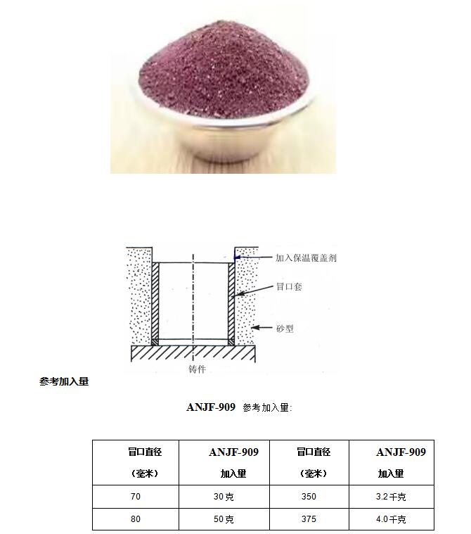 2.當(dang)金屬(shu)液(ye)澆注到冒口套上端時,根據下表提供的參(can)考用(yong)量立即加(jia)入(ru)本產品(pin),要(yao)將(jiang)發熱劑攤平(ping)使之厚度均勻。加(jia)入(ru)太(tai)遲或用(yong)量太(tai)少會降低冒口補縮(suo)效率。
